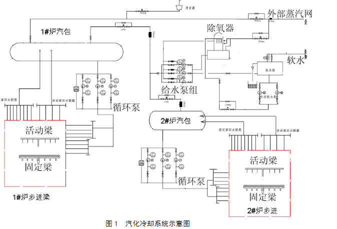 加熱爐汽化冷卻系統(tǒng)用于爐內(nèi)步進(jìn)梁冷卻,防止步進(jìn)梁高溫下變形、損壞,同時(shí)將冷卻水變成蒸汽部分分離出去。過程是:軟水進(jìn)入除氧器進(jìn)行除氧后(將軟水中氧進(jìn)一步減少)由給水泵注入汽包,汽包中的軟水由循環(huán)泵打入步進(jìn)梁內(nèi),一部分軟水變成蒸汽后以飽和蒸汽的形式收集,輸送至外部使用,另一部分軟水或蒸汽繼續(xù)參與步進(jìn)梁冷卻。